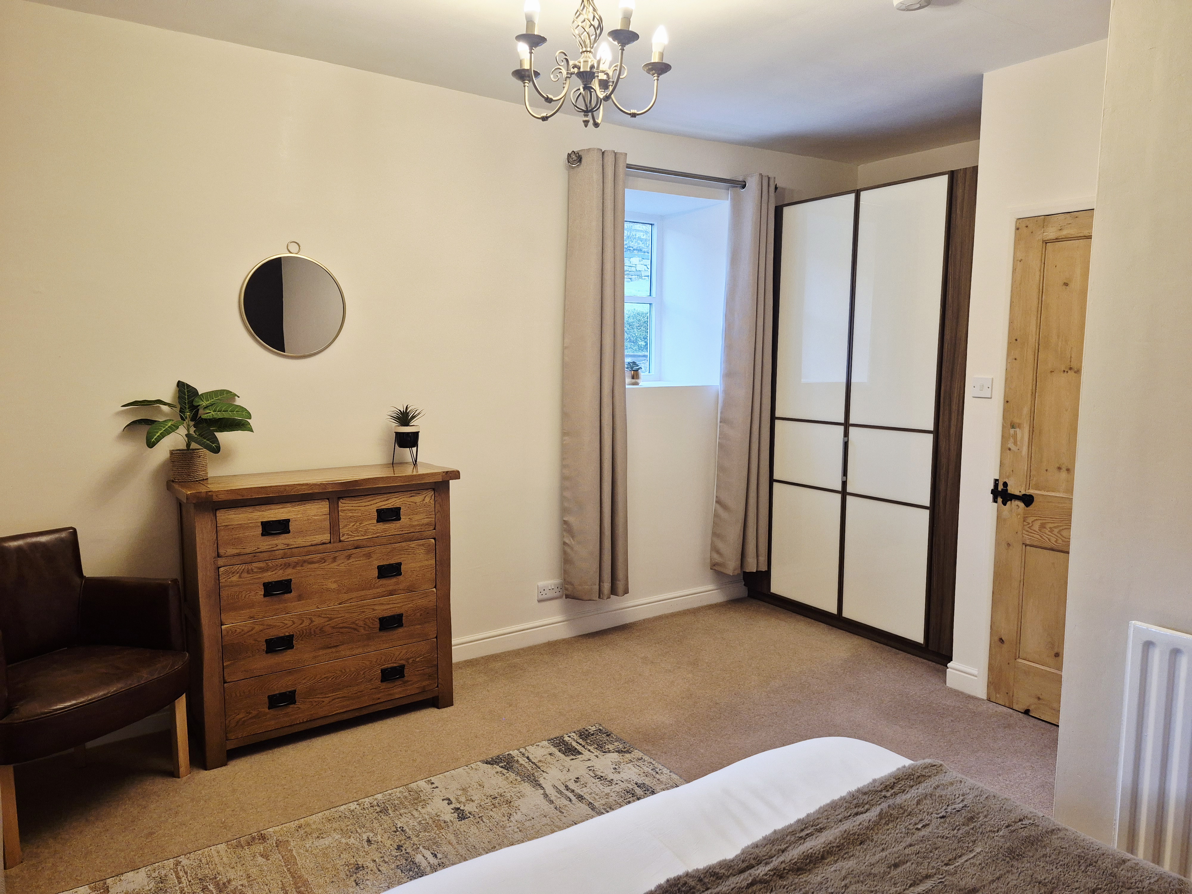 The large bedroom has a garden view, double bed, large wardrobe and chest of drawers. French doors lead onto the private patio